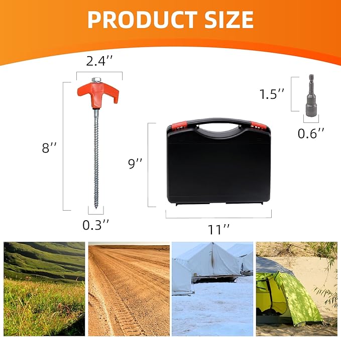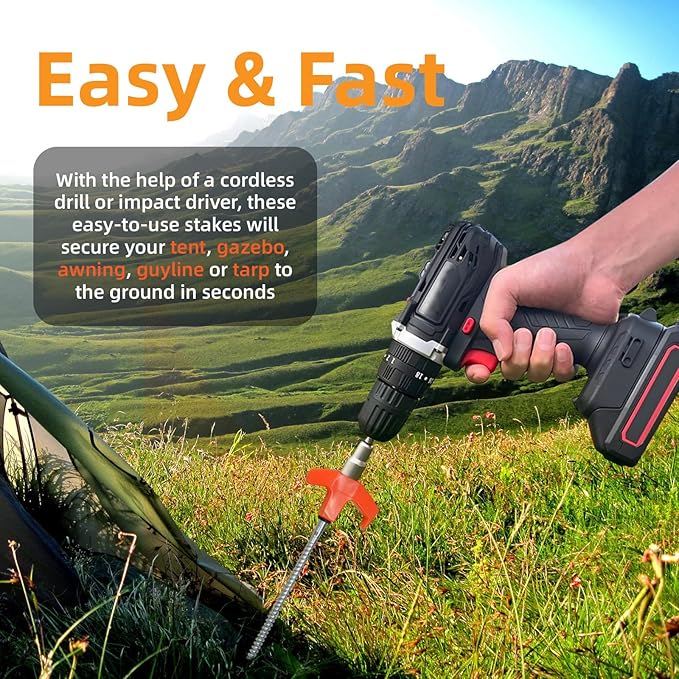 • ✅【8 Inch Screw Tent Stakes】Our tent stakes are quick and easy to install. With the help of a cordless drill or impact driver, these easy-to-use stakes can attach your tent, canopy, gazebo, awning, guyline or tarp in seconds Fixed to the ground.