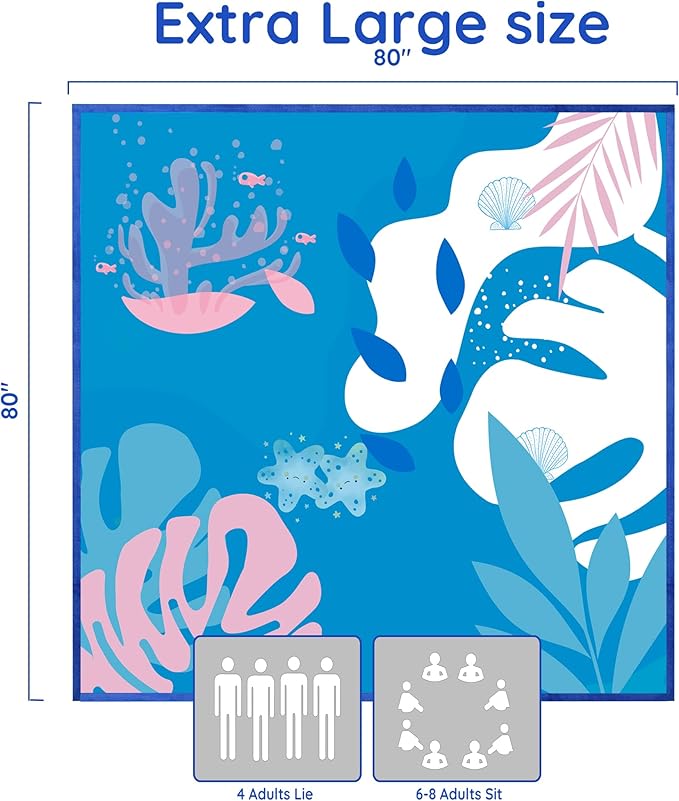 - EXTRA LARGE AND COMPACT BEACH MAT: This beach blanket boasts an 80”x80” size suitable for 1-8 adults. It folds up easily into the included backpack for effortless transportation and is a must-have for picnics and beach outings.