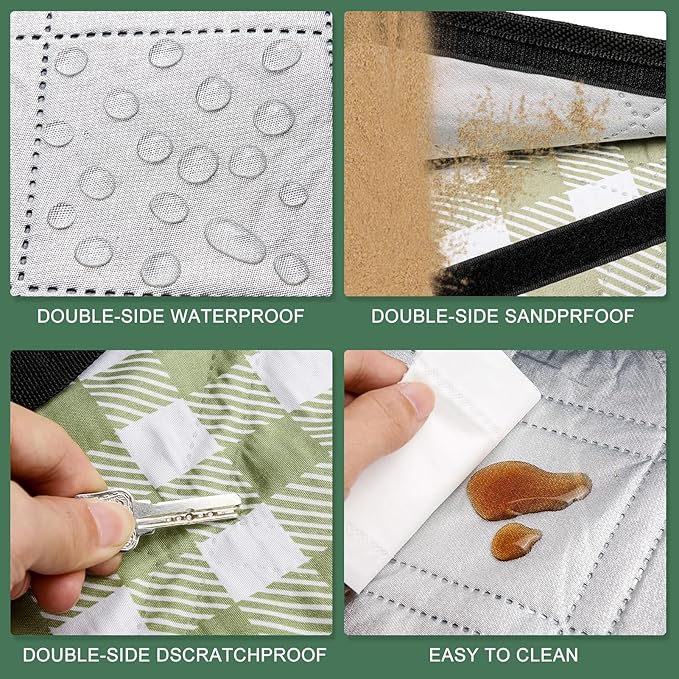 - WATERPROOF, SANDPROOF & SCRATCHPROOF-EASY TO CLEAN: Why are we 5 layers? Because we add an extra layer of protective film on the top and bottom. And The picnic blanket backing is made of high-quality Aluminium Film backing waterproof material to prevent it from getting wet on wet lawns or beaches. Picnic mats are easy to clean and care for, easily shaking off and wiping away dirt, mud, wet grass and sand.
