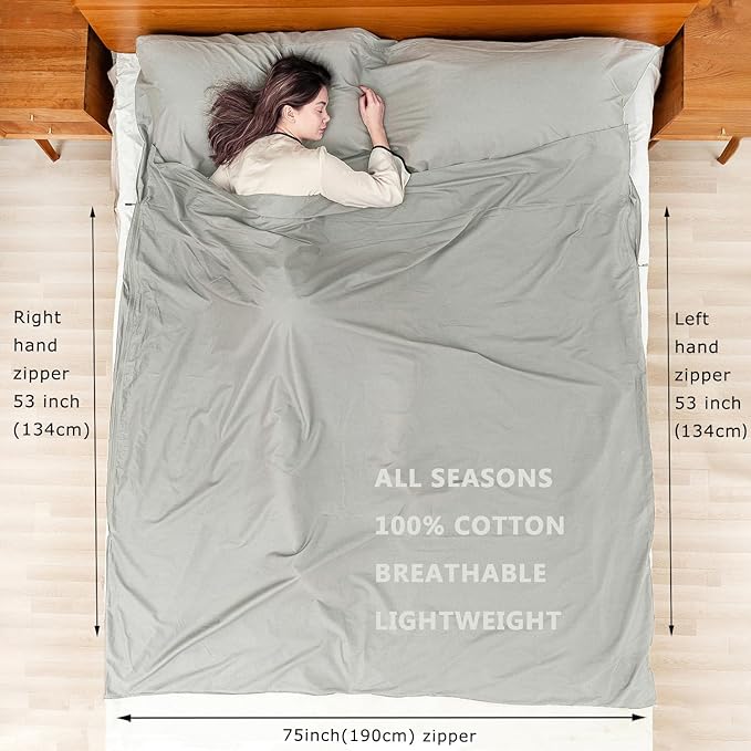 100% Cotton Sleeping Bag Liner with Full Length Zipper on 3 Sides; Single/Double Adult Sleep Sack for Travel & Camping, Multifunctional Travel Sheets (Unzipped 87”x87”) for Hotel, Lightweight