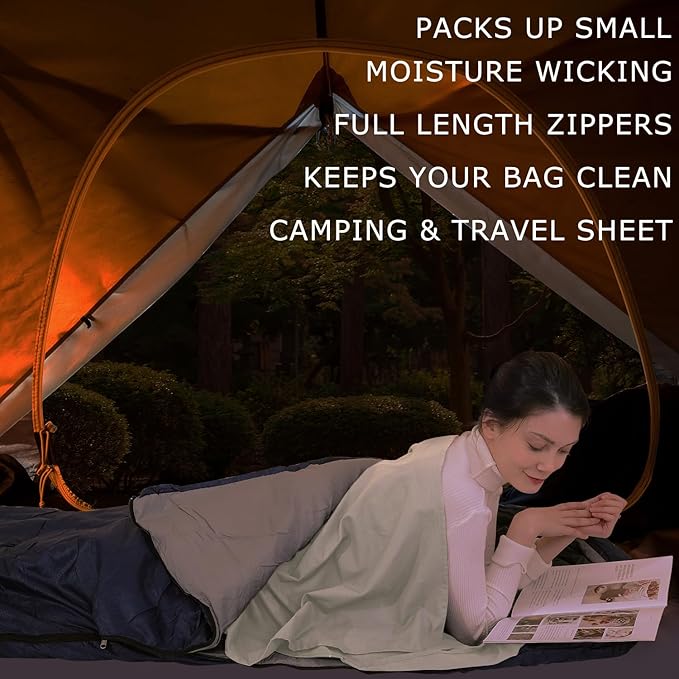 • This premium sleeping bag liner is made of an excellent quality cotton and the seams are very well constructed. The raw edges are encased in French seams rather than simply being zig-zagged to prevent fraying. This cotton fabric is soft, breathable, strong, healthy, easy to clean, long lasting, it adds another layer of extra 10°-15°F warmth when you need it. 100% Cotton is non irritating to even the most sensitive skin.