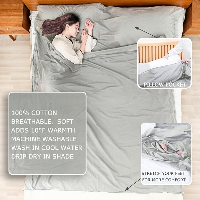• Bring this travel sheet with you whenever you travel because the bleach on some hotel sheets is too harsh. No matter where you travel to the world, no matter what season, this cotton sleeping bag will make you feel like sleeping on your own cotton sheets at home, cool, clean, comfortable and safe.