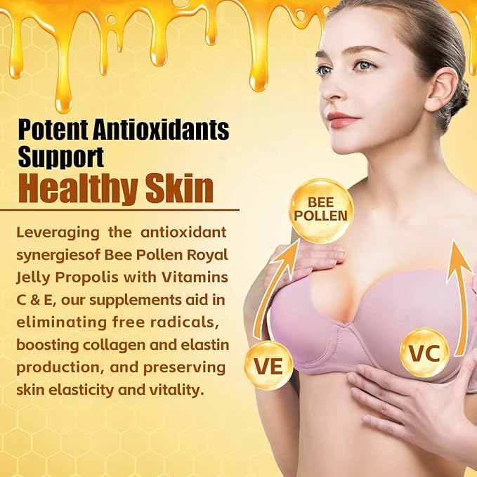 - 【Skin Rejuvenation】Drawing upon the robust antioxidant synergy of bee pollen and propolis, our bee pollen supplements invigorate the skin's natural radiance and safeguard it from harsh environmental factors. Packed with natural nourishing elements, our delicious gummies help to nourish your skin, preserve its elasticity, and enhance vitality, revealing a healthy, radiant complexion that shines naturally.