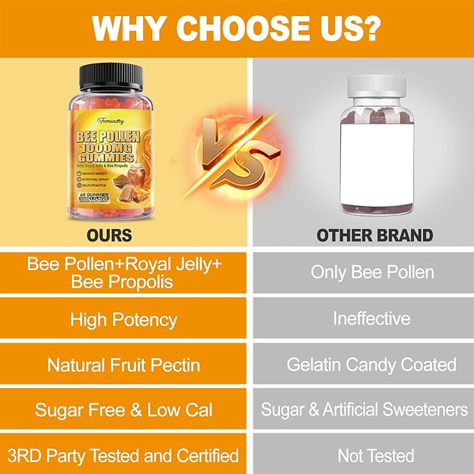 - 【5-In-1 Formula】Introducing our bee pollen gummies, a nutritional powerhouse packed with a triple bee blend. Each gummy contains 1000 milligrams of bee pollen, 500 milligrams of royal jelly, and 500 milligrams of bee propolis, complemented by essential vitamins C and E. Enjoy a tasty treat while easily meeting your daily nutritional needs, all while embracing a simpler, healthier lifestyle.