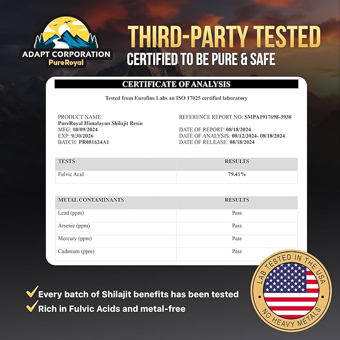 • Sustainably Sourced & Lab-Tested: Our shilajit is ethically sourced from the pristine Himalayan and Altai mountains and rigorously lab-tested in the USA to ensure purity, potency, and safety.