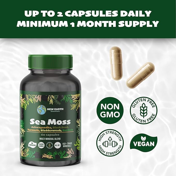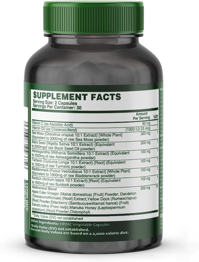- UNLOCK THE POWER OF SEA MOSS - Our Sea Moss All-in-One Capsules deliver a potent blend of Sea Moss combined with Black Seed, Ashwagandha, Turmeric, Bladderwrack, Burdock Root, and more. Each capsule is a powerhouse of nutrients designed to support your body from head to toe.