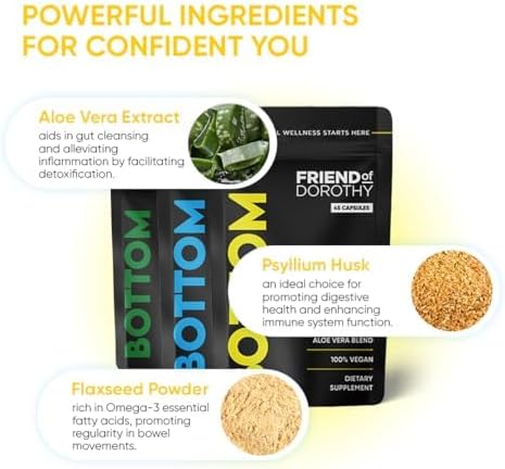 - 🌱 ONLY 3 PLANT-BASED INGREDIENTS: BOTTOM by Friend of Dorothy is a blend of flaxseed, psyllium husk, and aloe vera. Flaxseed deliver Omega-3 fatty acids, antioxidants, and fiber, while psyllium husk supports digestive health. Aloe vera reduces gut inflammation, ensuring a soothing elimination process. Embrace confidence and well-being with our clean and effective formulation.