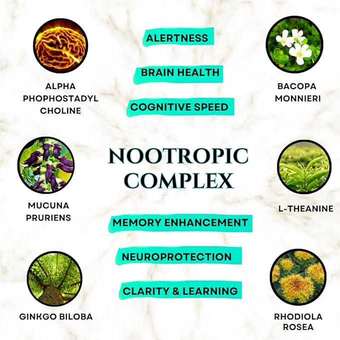 - Key Ingredients: Includes Alpha Phosphatidyl Choline, Bacopa Monnieri, Turmeric, Lions Mane, Ginkgo Biloba, Green Tea, Ashwagandha, Guarana, Maca Root, Damiana, Catuaba, Cordyceps, Shilahit, Mucuna, L-Theanine, L-Arginine, Rhodiola Rosea, Vitamin B3 as Niacin.
