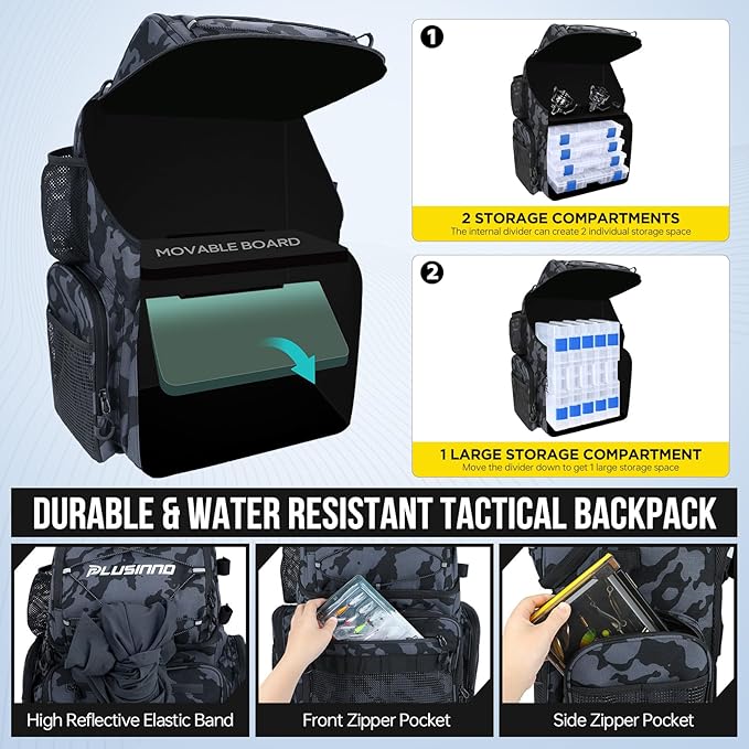 - Multifunctional Fishing Tackle Bag - PLUSINNO fishing backpack is designed with multiple pockets and storage areas tailored for different fishing gear. This fishing bag includes side pockets, a bottle pocket, numerous D-rings, and elastic cords for hanging towels or clothes... Providing convenient storage for fishing rods, bottles, keys, fishing pliers, and more. Each pocket is strategically placed for easy access, making the PLUSINNO fishing backpack an essential companion for any angler.