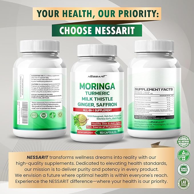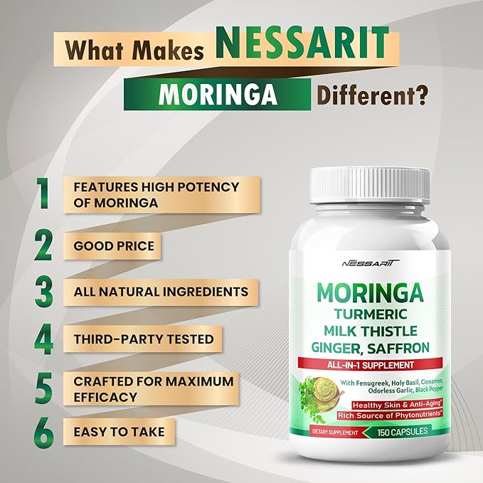 - Comprehensive Benefits: Nessarit Moringa Supplement boasts 10 lab-validated ingredients that enhance skin health, promote anti-aging, boost immunity, and support digestive wellness