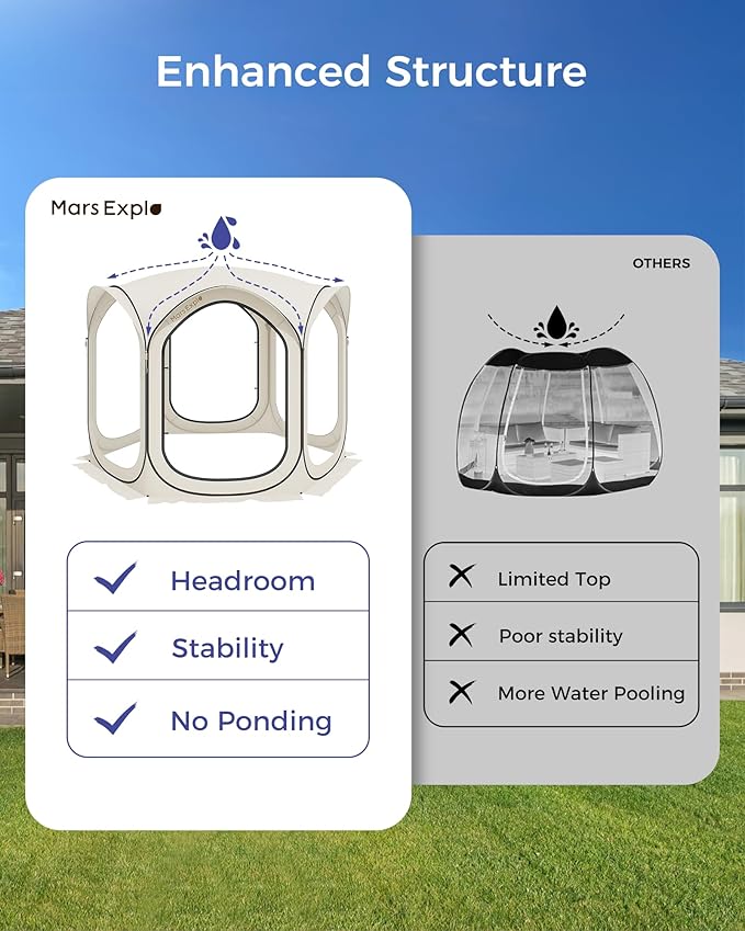 • ๐„๐ง๐ก๐š๐ง๐œ๐ž๐ ๐’๐ญ๐š๐›๐ข๐ฅ๐ข๐ญ๐ฒ & ๐–๐ž๐š๐ญ๐ก๐ž๐ซ ๐‘๐ž๐ฌ๐ข๐ฌ๐ญ๐š๐ง๐œ๐ž: Boasts a solid steel main frame, renowned for its superior strength, stability, and resistance to deformation or breakage compared to other brands. It is adept at withstanding diverse weather conditions. Included guylines, sandbags, and stakes ensure easy anchoring in windy scenarios. <b>Note</b>: For safety, avoid using this tent in wind conditions exceeding 24-30.8 mph