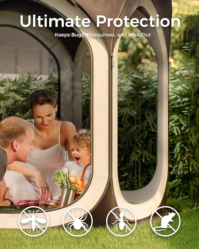 • ๐Œ๐š๐ฑ๐ข๐ฆ๐ข๐ณ๐ž ๐Ž๐ฎ๐ญ๐๐จ๐จ๐ซ ๐„๐ง๐ฃ๐จ๐ฒ๐ฆ๐ž๐ง๏ผšElevate your outdoor experience with our screen house, perfect for day and night use. It features a convenient hook for hanging lights and offers the option to add a light strip for enhanced illumination. Ideal for patios, picnics, and more, this screen house ensures a comfortable, bug-free environment. (Note: Lights sold separately