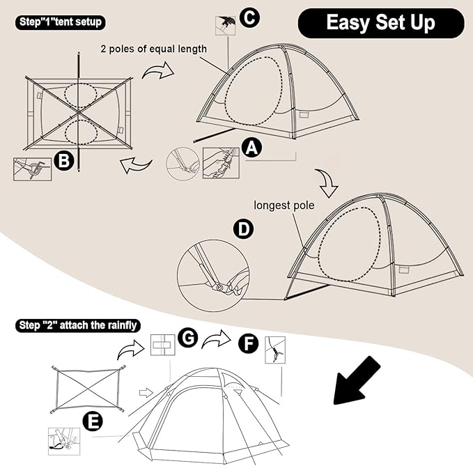 - 【Sturdy & Freestanding】Designed for extreme weather conditions, our 2 man tent boasts sturdy aluminum poles and secure pegs that provide excellent stability. The 3 crossing aluminum poles construction, along with adjustable wind ropes and seam taping, make this backpacking tent capable of standing up to strong winds. Additionally, the freestanding design allows you to easily move and reposition the camping tent without reassembly, making it perfect for versatile campsite setups.