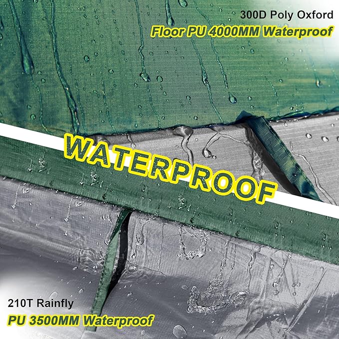 - 【Superior Waterproof Protection】Stay dry and comfortable no matter the weather with our 2 person backpacking tent. Crafted from high-quality materials, the 2 person tent features a 210T rainfly with a PU 3500MM waterproof rating and a 300D Poly Oxford floor with a PU 4000MM waterproof rating. This 4 season tent is fully field tested to withstand heavy rain, ensuring you remain protected from the elements during your camping trips.