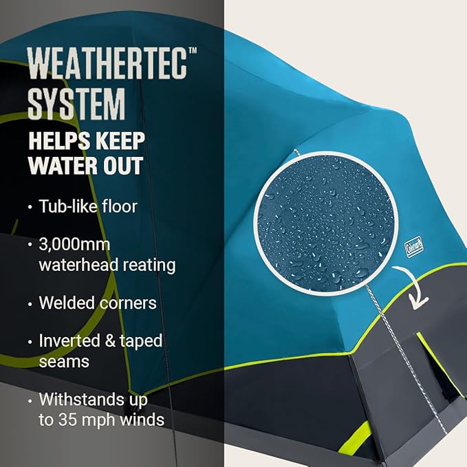 - BLOCKS WIND AND RAIN: WeatherTec system's tub-like floor, welded corners, waterproof 3,000mm waterhead fabric, and inverted seams and taped seams on rainfly and tent body help keep water from getting in; strong frame has been tested to withstand up to 35 mph winds