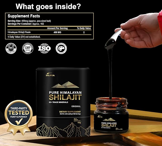 - PURE HIMALAYAN SHILAJIT: DLNIA 100% Original Organic Himalayan Shilajit Resin, a natural energy dynamo extracted from the top of Himalayas at an altitude of 18,500 feet. Experience the holistic benefits of this classic ayurvedic tradition, packed with 85+ vital minerals (humic acid, fulvic acid, iron, proteins, zinc, calcium, antioxidants, & more) ensuring you get the daily nutrients for a balanced lifestyle. Recent studies have shown that these essential nutrients power up energy, shield your immunity & hormonal balance
