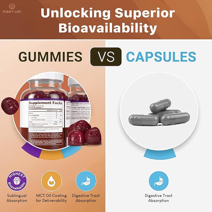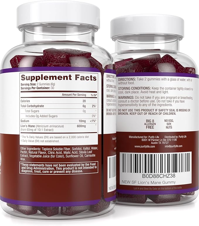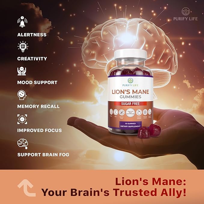 - [Clear Your Mind] - Purify Life's Lion's Mane extract gummies are specially crafted to support mental clarity and focus. Lion's Mane is renowned for its nootropic properties, aiding in concentration, memory recall, mood enhancement, and creativity. Whether you're a student, a professional, or simply want to keep your brain in top shape, these easy-to-take gummies are perfect for you.