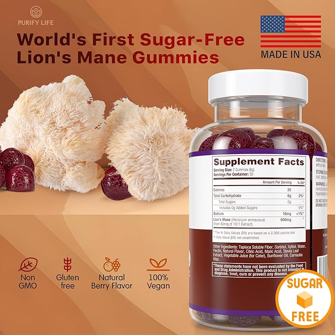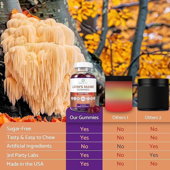 - [Ancient Wisdom in Modern Gummies] - Lion’s mane mushrooms (Hericium erinaceus) have a long history in traditional medicine, especially in Asian cultures and Native American healing practices. Lion's mane has shown promise in enhancing cognitive function. Enjoy improved mental acuity and immune support properties with Purify Life's easy-to-chew, sugar-free lions mane supplement gummies.