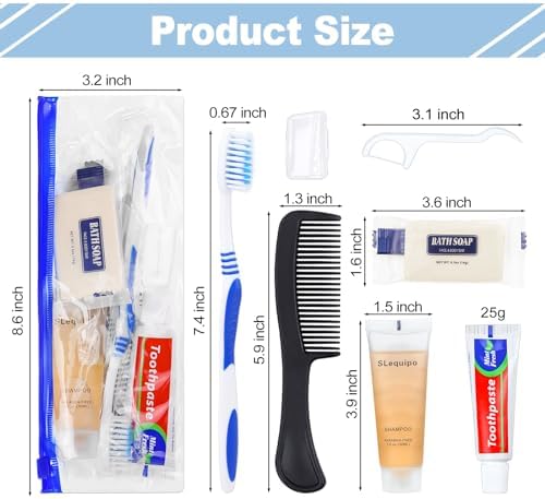 - What you get: Pack of 25 Basic Toiletry Kits. Each package includes 1*Soap(14g/0.5oz),1*Toothbrushes, 1*Toothpastes(25g/0.88oz) ,1*Shampoo(1 floz/30ml), 1*Combs, 1*Toothbrush head cover, 5*Floss picks, 1*Reusable zipper bag. Each set packed in a sealable bag for hygiene.