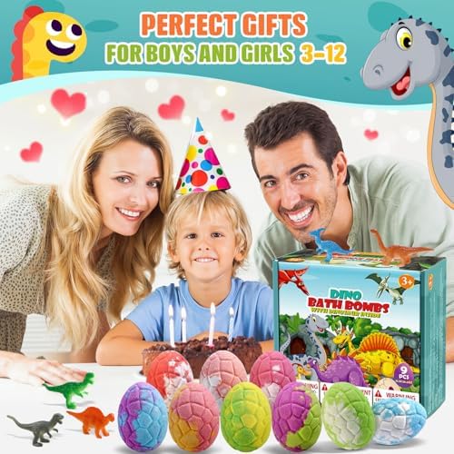 • Best Gifts for Boys & Girls:This kids bath bombs with dinosaur toys inside set is best gift for Christmas, birthdays, advent calendar, New Year, Easter, halloween basket, boo basket stuffers for kids any occasion where you want to surprise and delight your kids. Bath bombs have brightly colored, pleasant smell, and rich foam. It can be a perfect gift for kids aged 3-12 years old