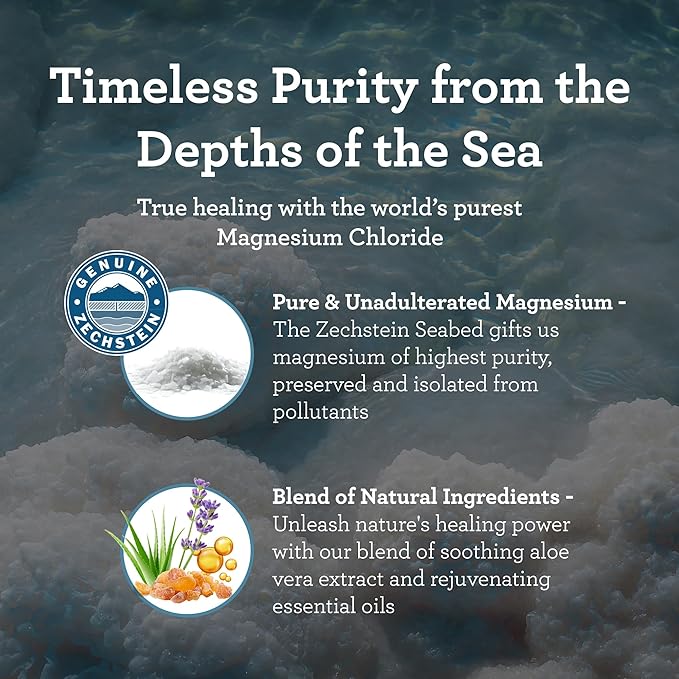• Purest Magnesium - Sourced from the pristine Zechstein seabed, our Zechstein magnesium oil contains fast-absorbing minerals infused with a blend of essential oils to accelerate your muscle recovery