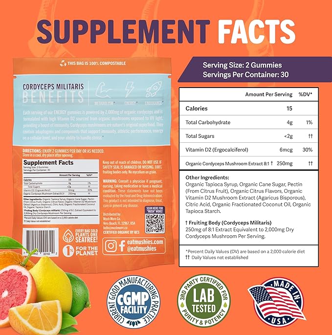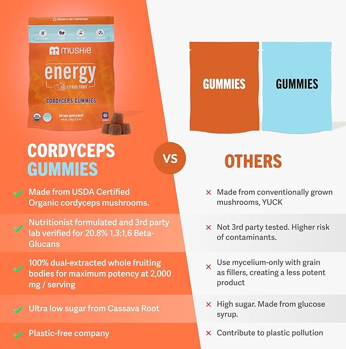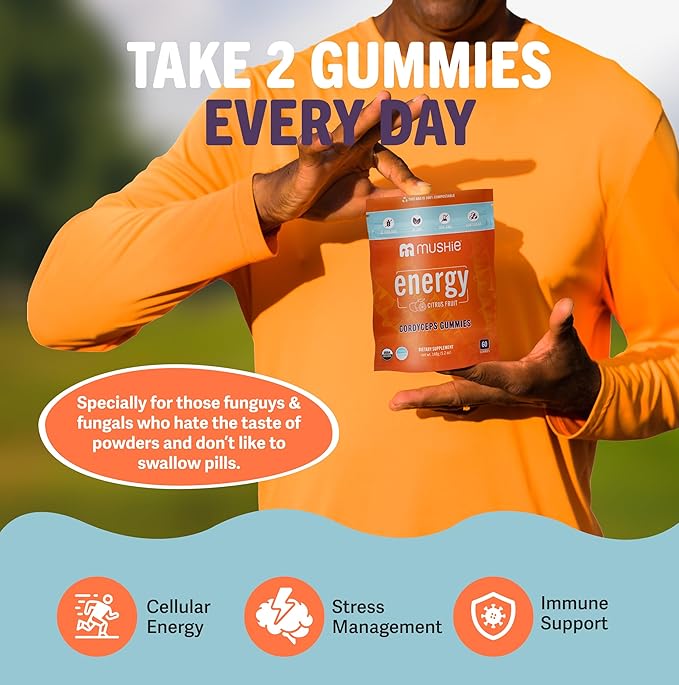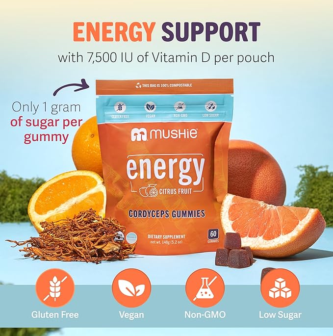 Mushie 100% Organic Cordyceps Mushroom Gummies - 2000mg Cordyceps Militaris Nootropic for Energy & Immune Support with Vitamin D - Vegan, Gluten-Free - 60 Count