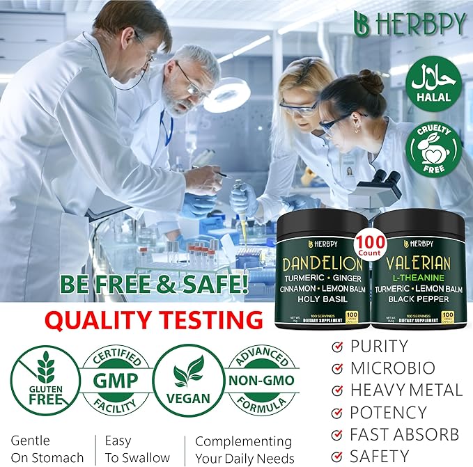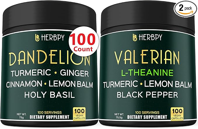 - ✓ 1 Pack 100 Count - HERBPY 5in1 Valerian Root Supplement - Supports Relaxation, Restful Night, Digestion, and Immune Health with L-Theanine, Lemon Balm, Turmeric, and Black Pepper - 100 Valerian Root Capsules - Recommended Use: 1 vegan Valerian pill daily.
