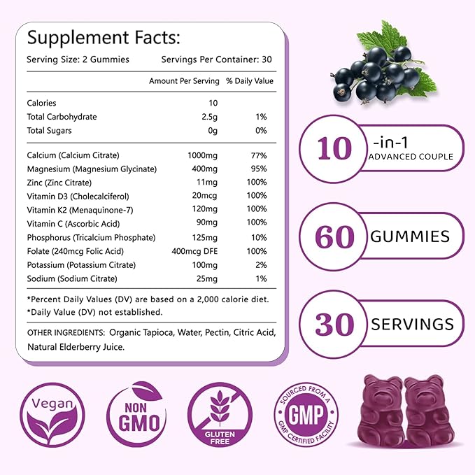 • PERFECT FOR THE WHOLE FAMILY: Safe and suitable for all ages, these elderberry-flavored calcium citrate gummies provide essential nutrients for men, women, and kids, supporting your family’s health in a delicious and convenient way.