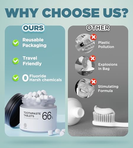 - FRESHNESS ON THE GO, PLANET-FRIENDLY ALWAYS! - Our travel size toothpaste is portable, lightweight, and TSA-friendly, a must-have for travelers, campers, or anyone on the go! Unlike traditional tube toothpaste, our toothpaste tabs won't be squishing open all over your stuff on the airplane. And they dissolve easier, leave no goopy messes in your sink. They are packed in reusable glass jar, slashing plastic waste and championing sustainability. Every tab you use is a win for you and the planetďź
