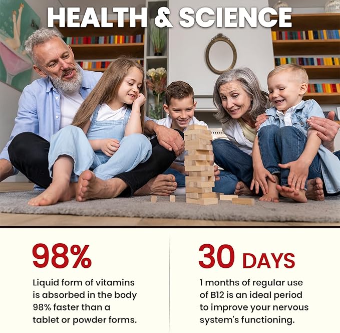 • HIGH ABSORPTION B12 COMPLEX: Our Triple Vitamin B12 liquid supplement has Methylcobalamin 6000 mcg, Adenosylcobalamin 2000 mcg, and Hydroxocobalamin 2000 mcg. Our liquid vitamin b12 formula is the most pure, active, and bioavailable, which can help with better energy, better brain health, and an increased mood