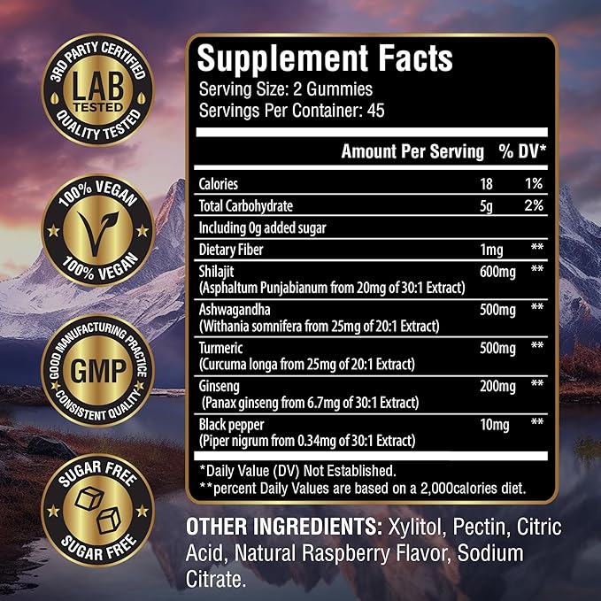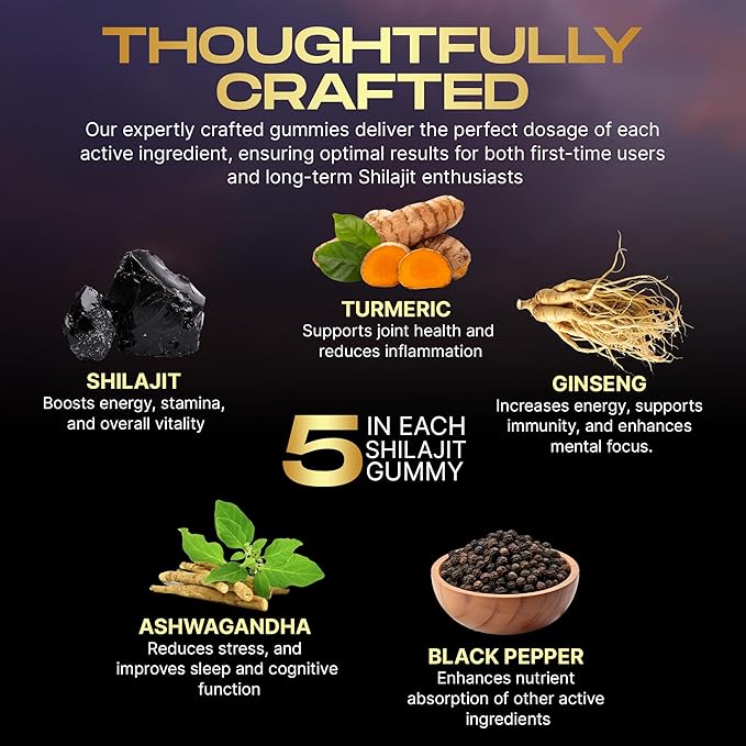 - POWERFUL INGREDIENTS: These powerful gummies are crafted with 100% pure Himalayan Shilajit and fortified with Ashwagandha, Turmeric, and Ginseng for added health benefits.