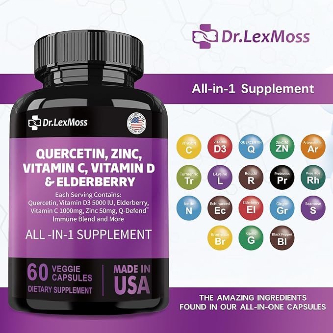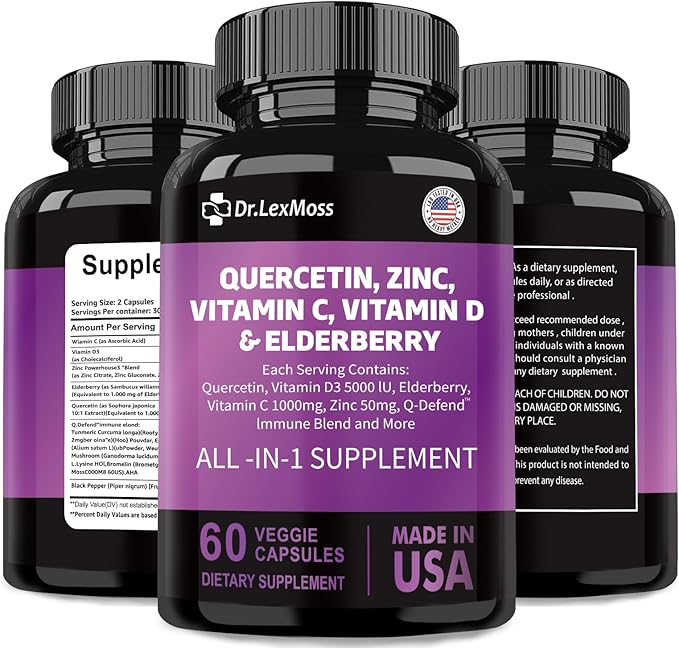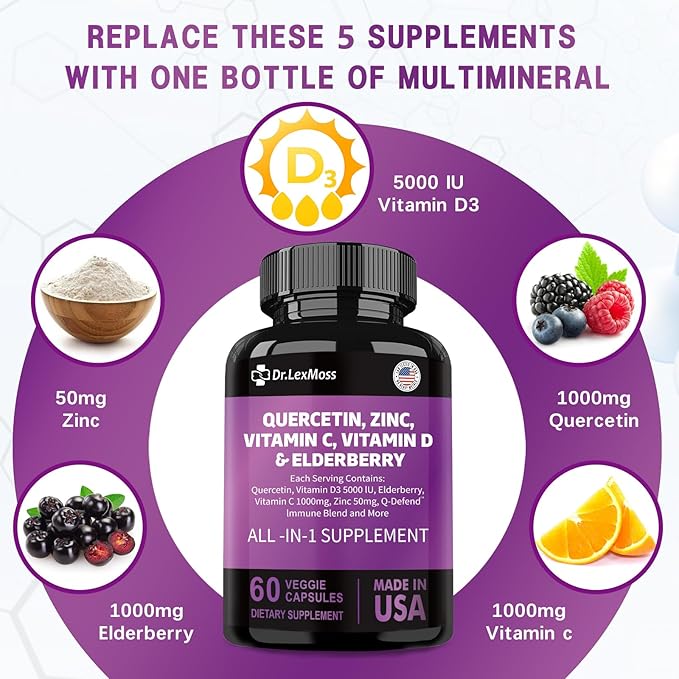 60 Count Quercetin 1000mg Zinc 50mg Vitamin C 1000mg Vitamin D 5000IU Immune System Support Supplement with Echinacea Ginger Bromelain Sea Moss Garlic Nettle Vegan Capsules for Men and Women,USA