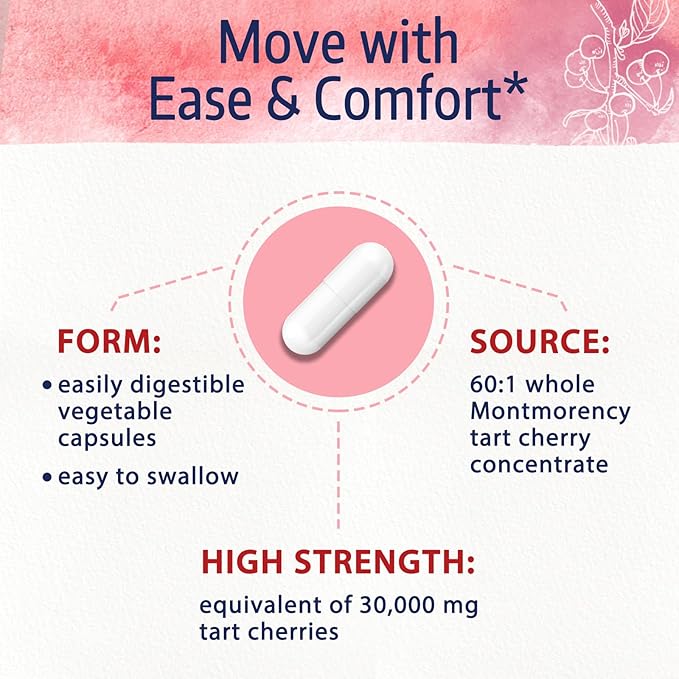 - Improved Mobility & Better Rest*: Specific foods like meats and sweets can cause excess uric acid buildup in your body. Our tart cherry extract will help keep your uric acid levels balanced while flushing the excess out, helping you move with ease and comfort.* In addition, this superfruit contains naturally occurring melatonin that may help you get the rest you need by balancing your internal body clock.*
