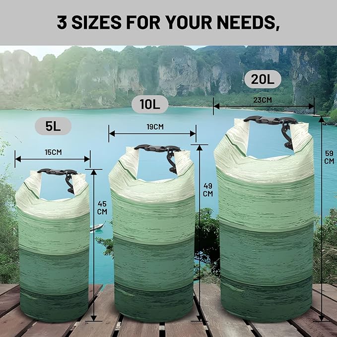 - Adjustable Carrying Options: Available in 5L and 10L with a removable shoulder strap for cross-body carry, or a 20L version featuring two adjustable straps for backpack-style comfort.Roll-top closure system provides secure watertight seal, keep your gear dry in any wet situation.Unique Retro Wooden Plank design dry bag backpack Carry it your way!