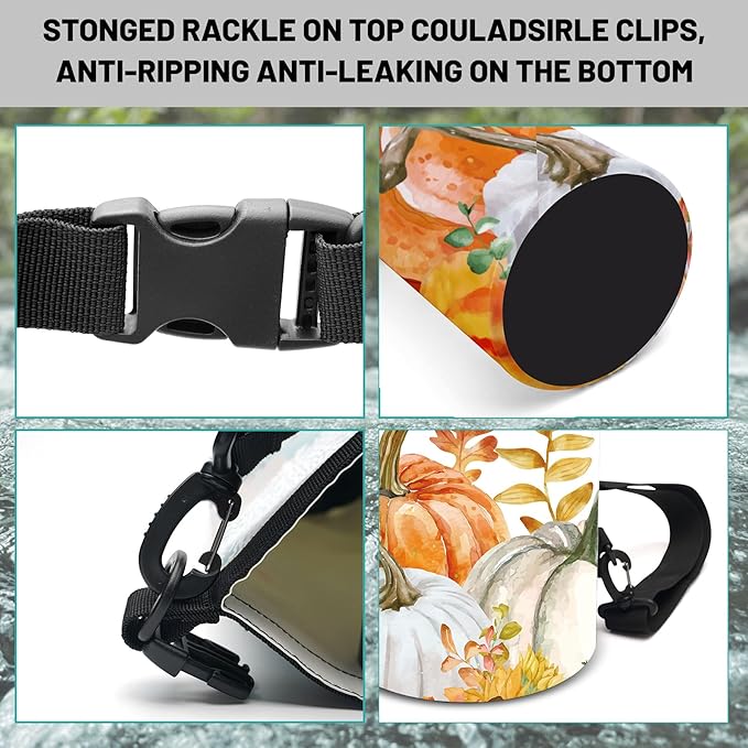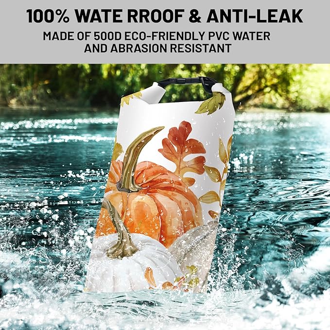 - Adjustable Carrying Options: Available in 5L and 10L with a removable shoulder strap for cross-body carry, or a 20L version featuring two adjustable straps for backpack-style comfort.Roll-top closure system provides secure watertight seal, keep your gear dry in any wet situation.Unique Autumn Pumpkin Maple Leaves Sunflower design dry bag backpack Carry it your way!