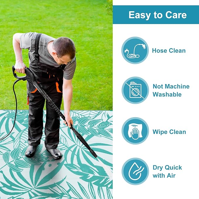 • Easy to Clean: Our recycled outdoor plastic straw rug is waterproof, stain-resistant, and breathable. Spills, sand, and dirt are no problem—simply sweep with a soft brush or towel, or hose it down for a deeper clean. Then, let it air dry quickly