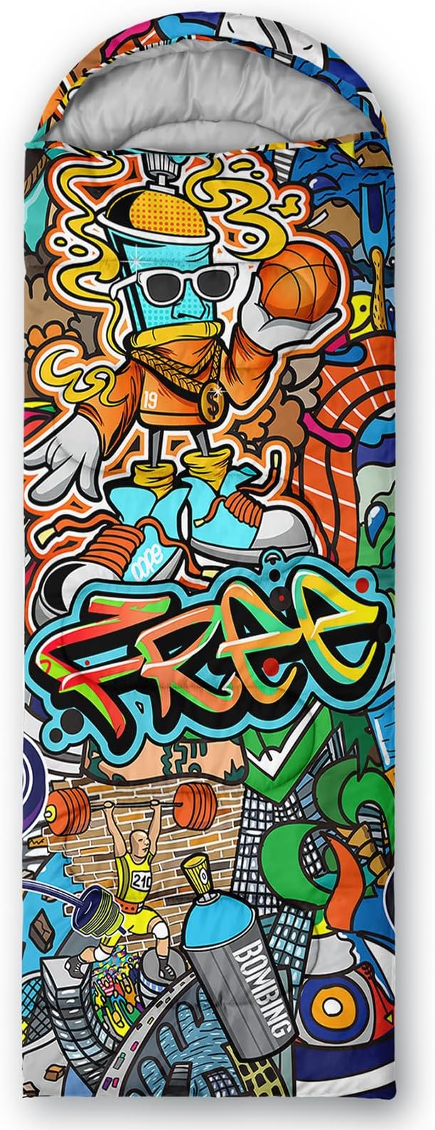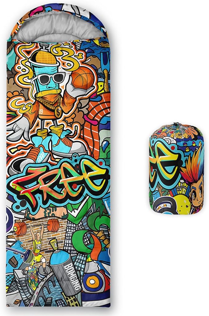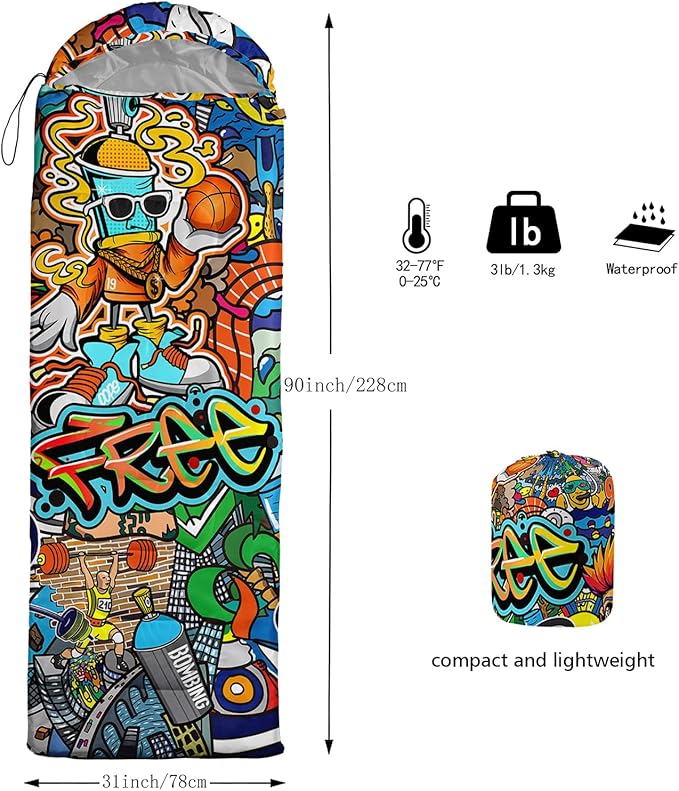 - Unique Hip Hop Design:This Hip Hop pattern sleeping bag is made of 3D digital printing with vibrant colors and patterns,size: 31W x 90L inches,temperature range: 32℉-77℉ (0℃-25℃),it also also have a weather resistant waterproof design to keep you warm and prevent you from any dampness,can be used in 3 seasons