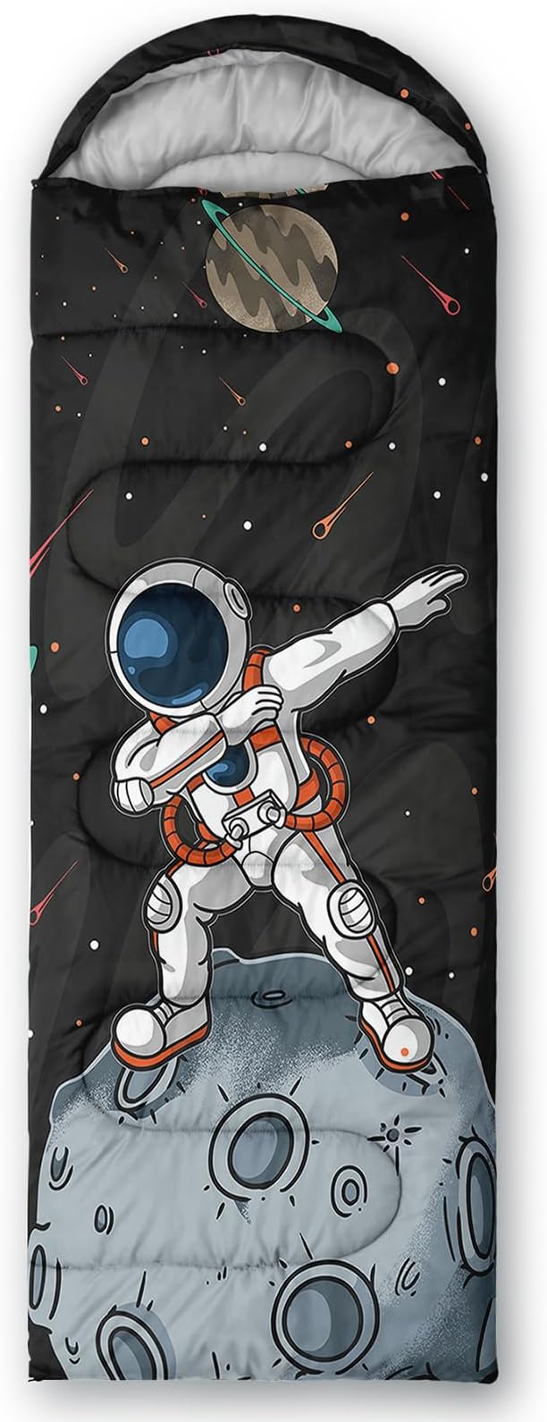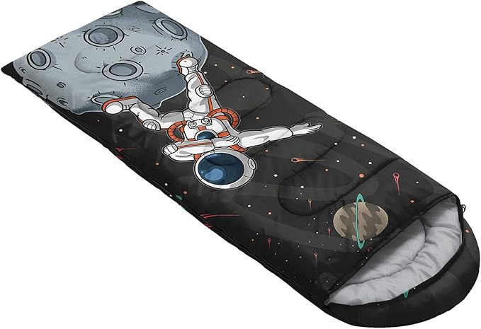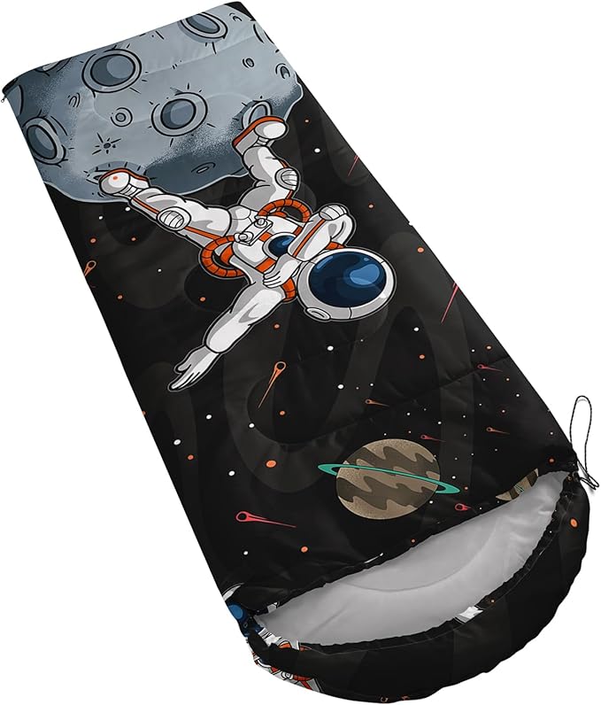 - Unique Astronaut Design:This Astronaut pattern sleeping bag is made of 3D digital printing with vibrant colors and patterns,size: 31W x 90L inches,temperature range: 32℉-77℉ (0℃-25℃),it also also have a weather resistant waterproof design to keep you warm and prevent you from any dampness,can be used in 3 seasons