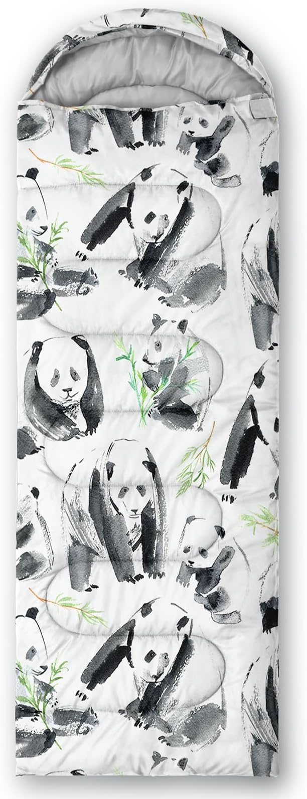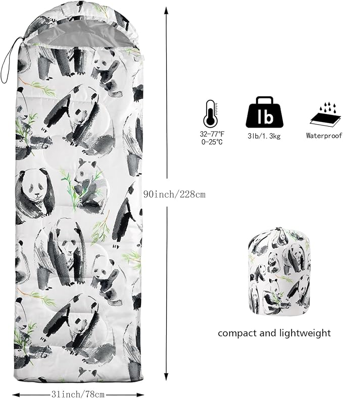 • Unique Panda Design:This Panda pattern sleeping bag is made of 3D digital printing with vibrant colors and patterns,size: 31W x 90L inches,temperature range: 32℉-77℉ (0℃-25℃),it also also have a weather resistant waterproof design to keep you warm and prevent you from any dampness,can be used in 3 seasons