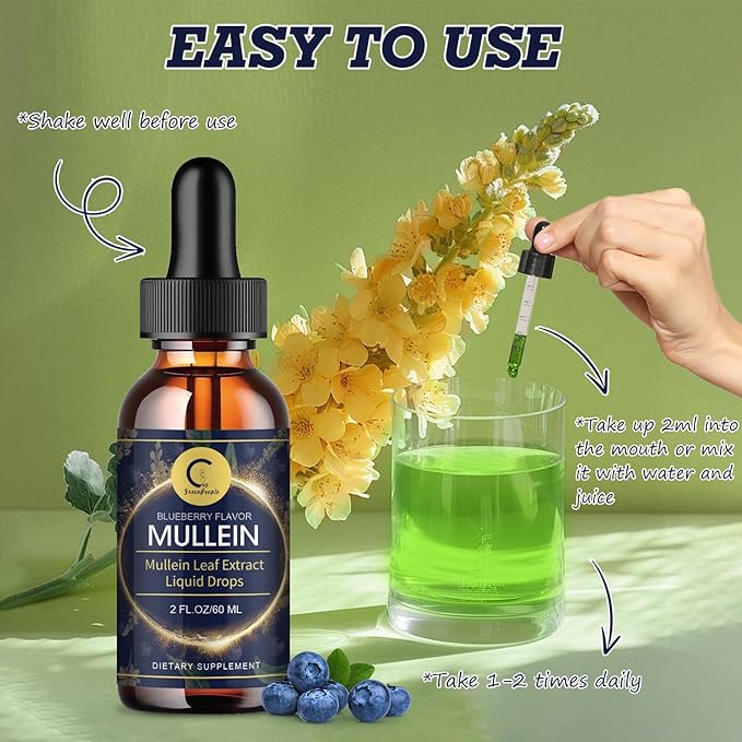 - WIDE RANGE OF EFFECTS: Mullein is high in saponins flavonoids, phenylethanoid, and iridoids which give the product it's health benefits and ability to lung cleanse, Mullein is also known for its immune-boosting properties. The mullein drops are formulated to provide comprehensive support to your immune system, It also helps aid in better digestion and improve overall well-being.