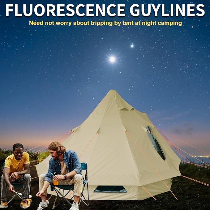 - MORE INTERIOR SPACE: 29lbs. Without center pole, you can easily fit more glamping gears than normal 3m bell tent. Optimized layout flexibility. Ideal for 4-5 sleep bags/a king size bed. No more worrying about the center pole taking up your bed space.