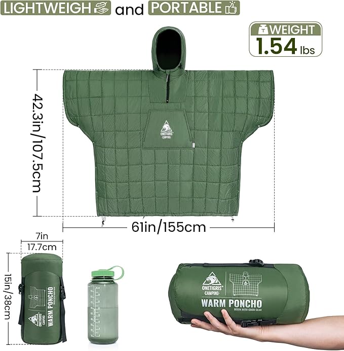 - Ultralight and Portable:: When unfolded, the honcho poncho measures 84.6 x 61 inches, but packs down to just 15 x 7 inches in its included compression sack. After folding and compressing, it becomes small and space-saving. Weighing only 1.54 lbs, this compact blanket poncho is lightweight, easy to fit in a backpack, and can even be used as a pillow, making it perfect for travel or camping