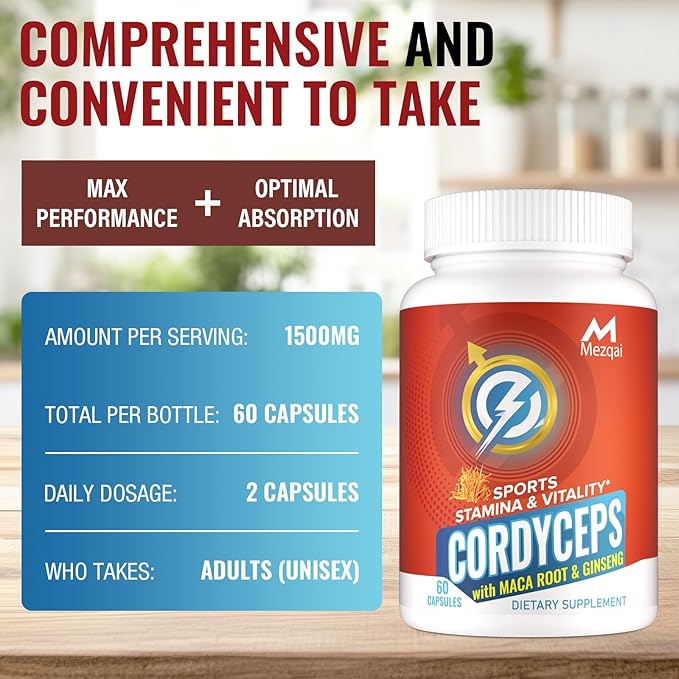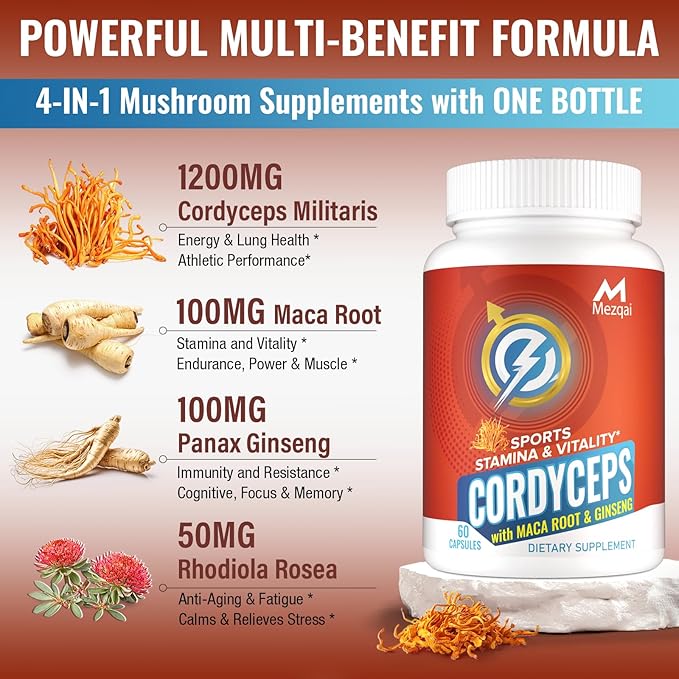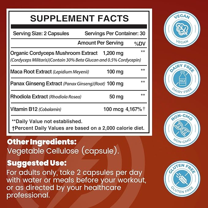 - PREMIUM UNISEX FORMULA: Cordyceps Mushroom Capsules are what you would expect. Cordyceps support overall health and can be a fitness supplement to aid oxygen absorption. Organic Cordyceps Militaris can help achieve higher endurance levels and optimal athletic performance. Ginseng and Maca Root can help more desire, vitality & vigor, increase energy and stamina, and elevate well-being. Rhodiola, when used together with cordyceps mushroom, can produce fatigue-relieving effects