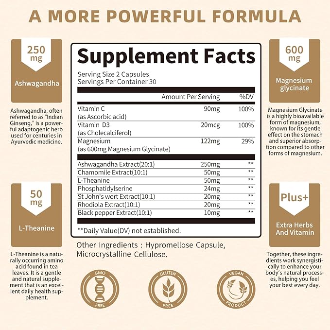 - 30-DAY SUPPLY, 60 CAPSULES: Our cortisol supplement provides a generous 60-day supply with 120 easy-to-swallow vegan capsules. Enjoy the full wellness benefits by taking two capsules daily