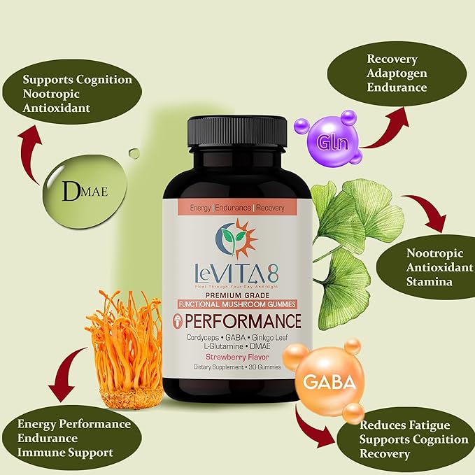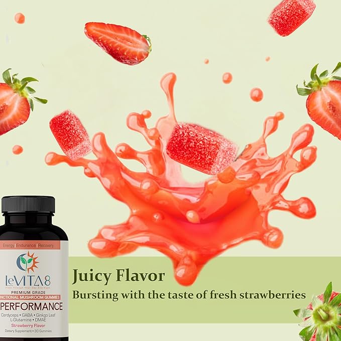 - No Crash, Just Peak Performance: Our strawberry-flavored gummies are formulated with Cordyceps, GABA, Ginkgo Leaf, L-Glutamine, & DMAE. Just 1 gummy delivers the energy boost you need for your workouts, outdoor adventures, or beating that afternoon slump