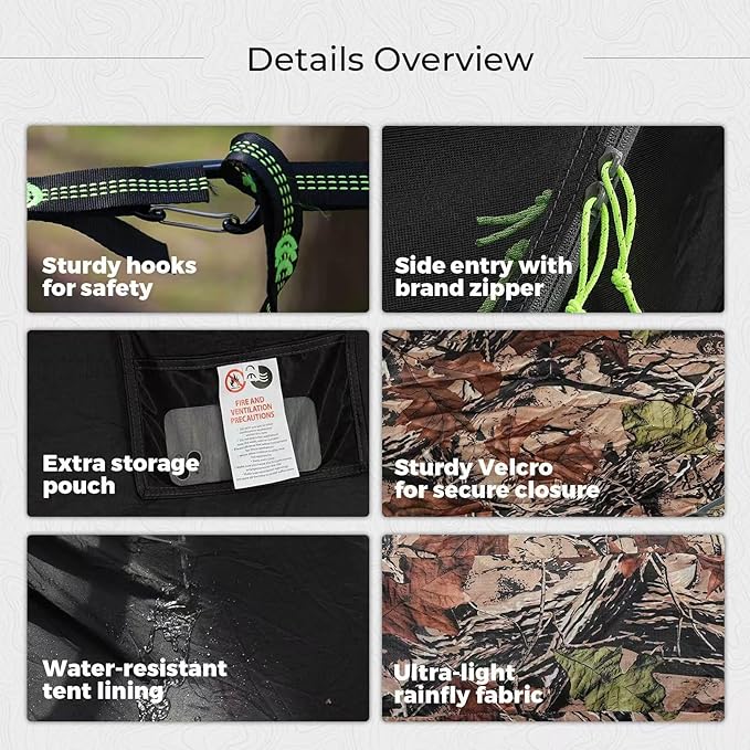 - Included Components : Tree Straps, Carabiners, Support Poles, Storage Bag, Rainfly