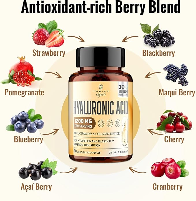 • 11 Berry Blend: Hyluronic Acid Contains Açaí Berry, Goji Berry, Blueberry, Pomegranate, Strawberry, Raspberry, Blackberry, Elderberry, Maqui Berry, Cherry, and Cranberry. Hyaluronic Acid Capsules Slow Down Cell Damage, Delay Aging, and Strengthen the Immune System