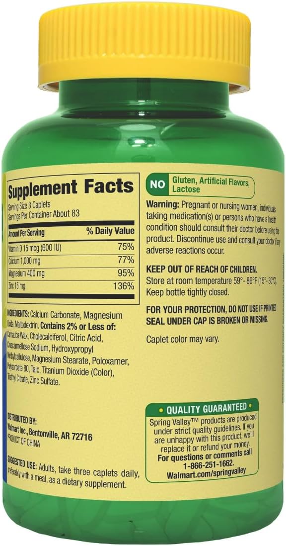 • Convenient Daily Dosage: Spring Valley Calcium, Magnesium & Zinc Comes in a bottle of 250 coated caplets for a convenient daily dosage.