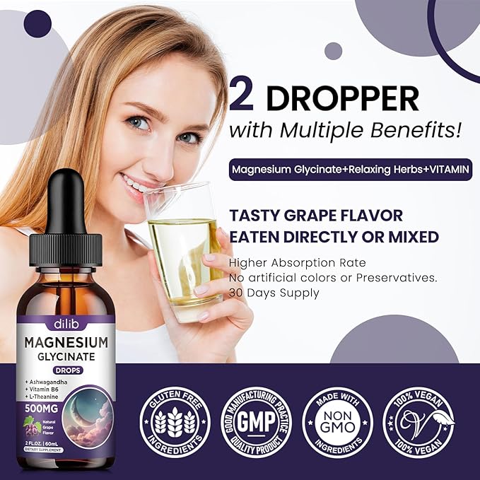 - NATURAL GRAPE FLAVOR AND VEGETARIAN: The great tasting liquid magnesium glycinate supplement drops have a yummy grape flavor that everyone loves. And easier to take: directly into the mouth or placed under the tongue which may have a faster and higher absorption rate compared to capsules, pills, or gummies. It is soy free, non-GMO, gluten-free, dairy-free, and vegan-friendly which is more suitable for all men's and women's dietary needs