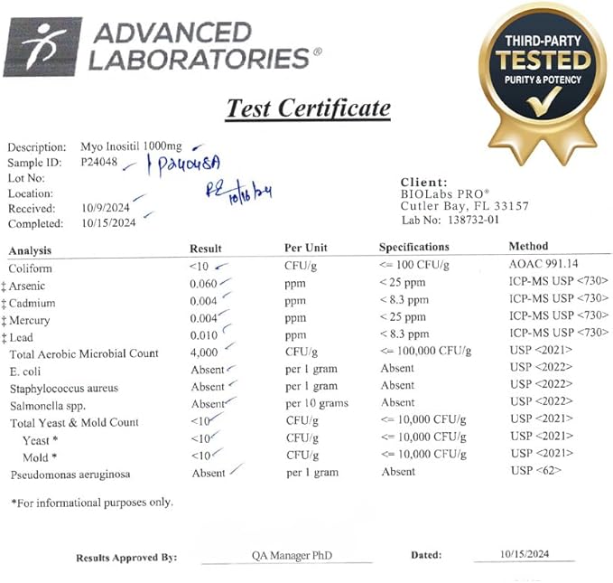 • Crafted in the USA with Uncompromising Standards – When it comes to quality, there’s no room for shortcuts. BIOLabs PRO Myo-Inositol is proudly made in the USA in an FDA-registered, Kosher-certified facility. Rigorous third-party testing ensures every batch upholds the highest standards of purity and potency, so you can trust that you're investing in a product designed with your wellness in mind.